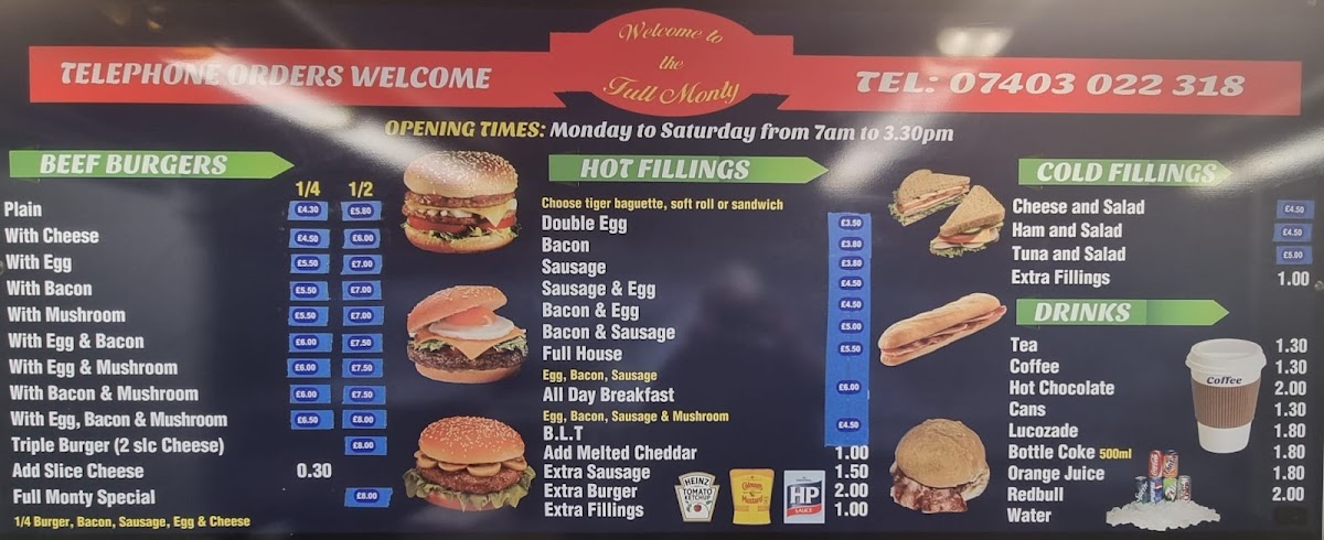 From a reviewer’s perspective, the menu at The Full Monty Epsom keeps things simple yet satisfying, focusing on classic comfort options done well. The selection of beef burgers-Plain, With Cheese, With Egg, With Bacon, and With Mushroom-offers familiar choices that cater to a range of tastes, while the hot fillings like Double Egg, Bacon, Sausage, Sausage & Egg, and Bacon & Egg provide hearty, no-fuss combinations ideal for a quick, filling bite. For lighter options, the cold fillings such as Cheese And Salad, Ham And Salad, and Tuna And Salad add a fresh balance, with Extra Fillings available for customization. The drinks menu, including Tea, Coffee, Hot Chocolate, Cans, and Lucozade, rounds out the offering with all the essentials. Overall, while the menu may not be extensive, its straightforward approach and focus on classic favorites make it a reliable choice for those seeking simple, satisfying food at reasonable value.